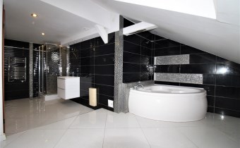 -dużej łazienki z kabiną prysznicową, narożną wanną, umywalką i toaletą.