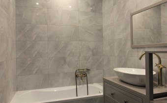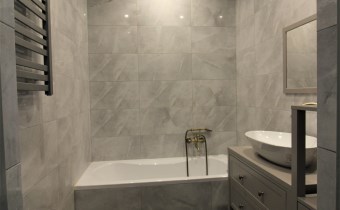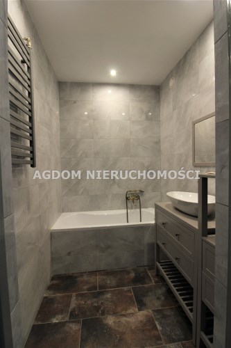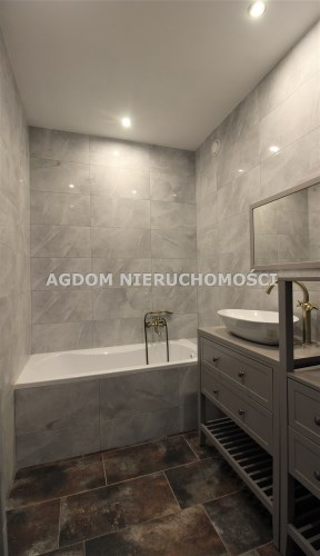 Cudna łazienka z wanną, lustrem, meblami, umywalką, wykończona glazurą i terakotą.
