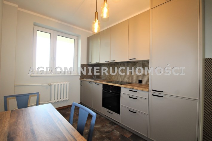 Piękna stonowana kuchnia w nowoczesnej zabudowie z praktycznym blatem roboczym wraz z nowymi sprzętami AGD (zmywarka, płyta indukcyjna i piekarnik elektryczny).
