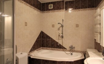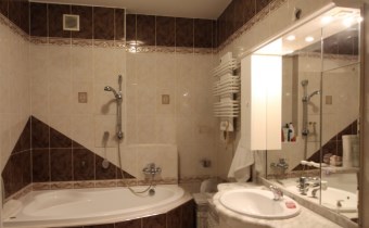 - komfortowej łazienki z kabiną prysznicową, wanną, umywalką, lustrem, zabudową meblową i toaletą,