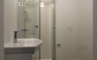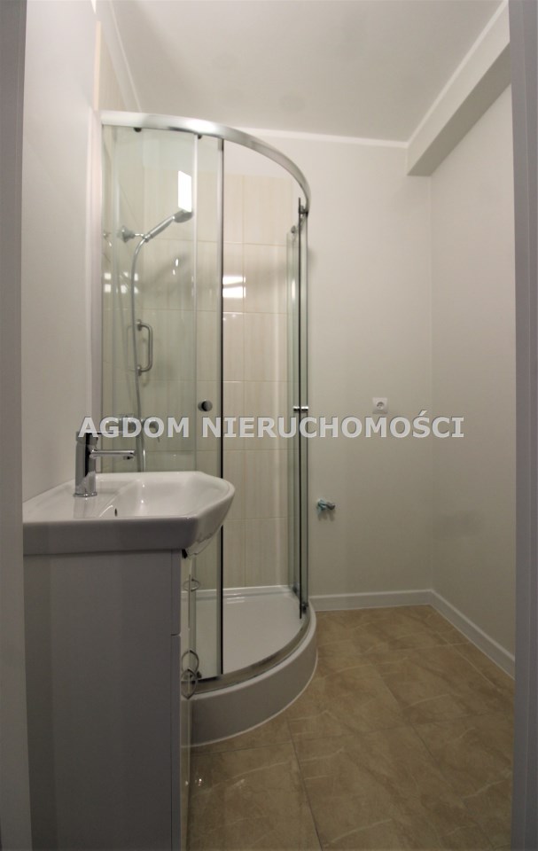 -funkcjonalnej, elegancko wykończonej łazienki z kabiną prysznicową, umywalką, pralką: