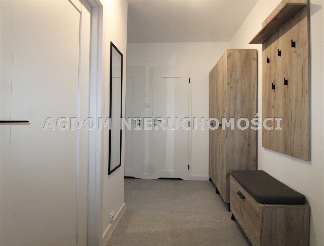 -przedpokoju z praktyczną szafą, siedziskiem z wieszakami i komodą.